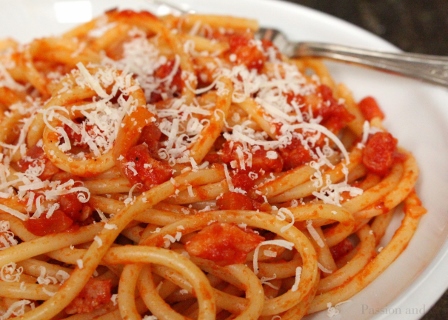 This is a tasty, simple and fast recipe that you can make anytime you crave for a spicy pasta dish. The amatriciana (ahm-mah-tree-CHA-na) is mouthwatering sauce for pasta, made with guanciale (or bacon), tomato and Pecorino cheese. Everything is seasoned with chili pepper. The name of this delicious recipe comes from Amatrice, a town at the center of the Apennines ( in the province of Rieti), where on the last weekend of August, a large quantity of this tasty dish is prepared for the local festival.