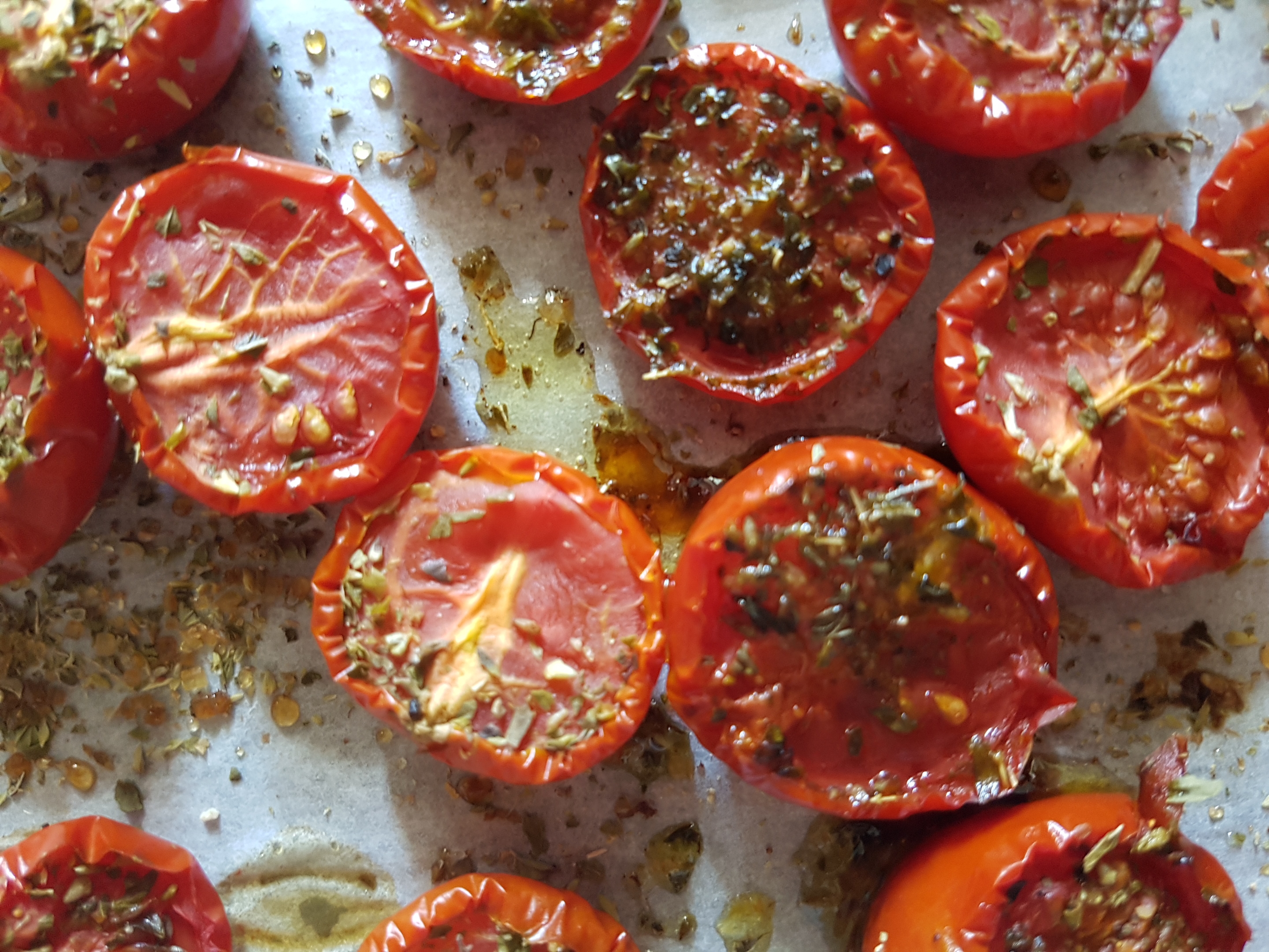 Cherry tomatoes confit are deliciously caramelized cherry tomatoes, ideal to serve as an appetizer or side dish. They are also perfect as a topping for pasta or bruschetta. After having cut them in half, just season with salt, pepper, brown sugar, and oregano or thyme. Drizzle with some olive oil and bake for two hours. The secret is to evaporate the water out of the tomatoes, without making them too dry! This recipe is a healthy and tasty one that can be included in the Mamma Mia! Diet eating plan.