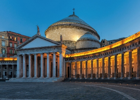 From the Maschio Angioino one can take on an entirely new itinerary by doubling back to the opposite direction toward Piazza del Plebiscito. Plebiscito is framed by the Basilica of San Francesco di Paolo (it rather resembles the Roman Pantheon in form), and by the Bourbons' Royal Palace, or Palazzo Reale.