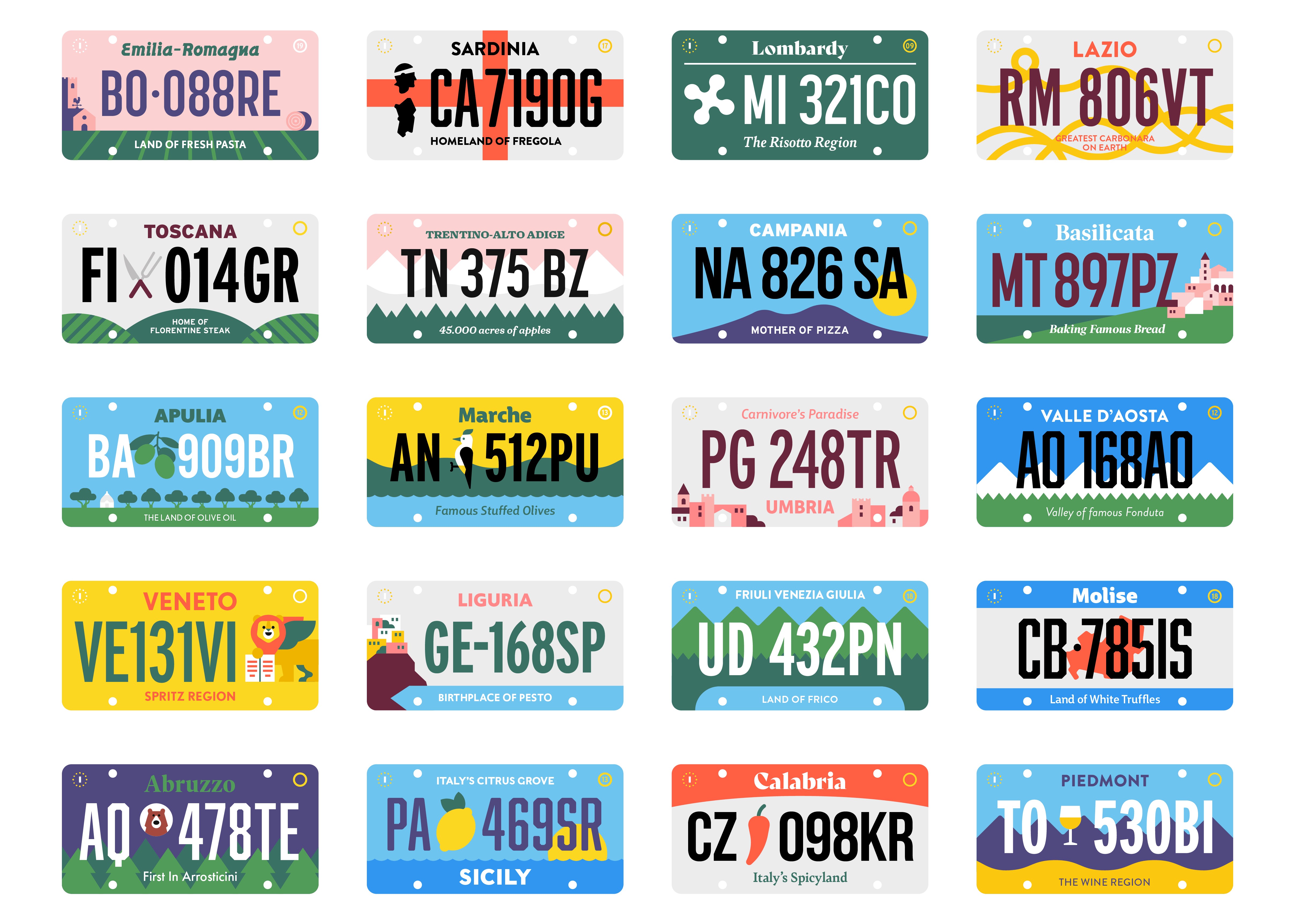 Giulia came up with this idea while traveling in her homeland and this project is her attempt to answer to that curiosity. Since the word “plates" evokes both automotive and culinary worlds, she designed them with a focus on traditional products from the 20 Italian regions. Wine and food are a big part of the Italian tradition, and every region is unique, so it was her goal to honor this diversity, with a hint of cuteness and humor.