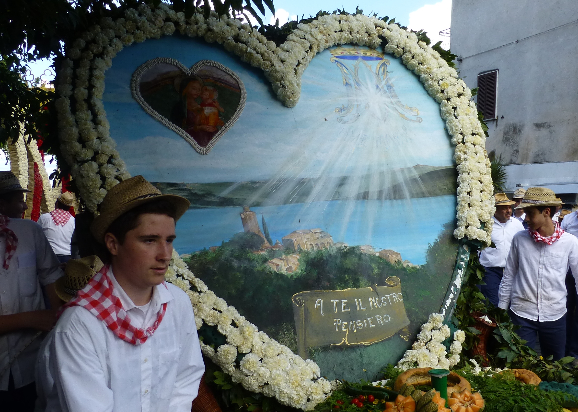 This is a parade of floats dedicated to Mary enriched by fountains that form water games pulled by oxen of Maremma, donkeys, horses. We can find real masterpieces of flowers and fruit that have the image of the Virgin and of the cornucopia.