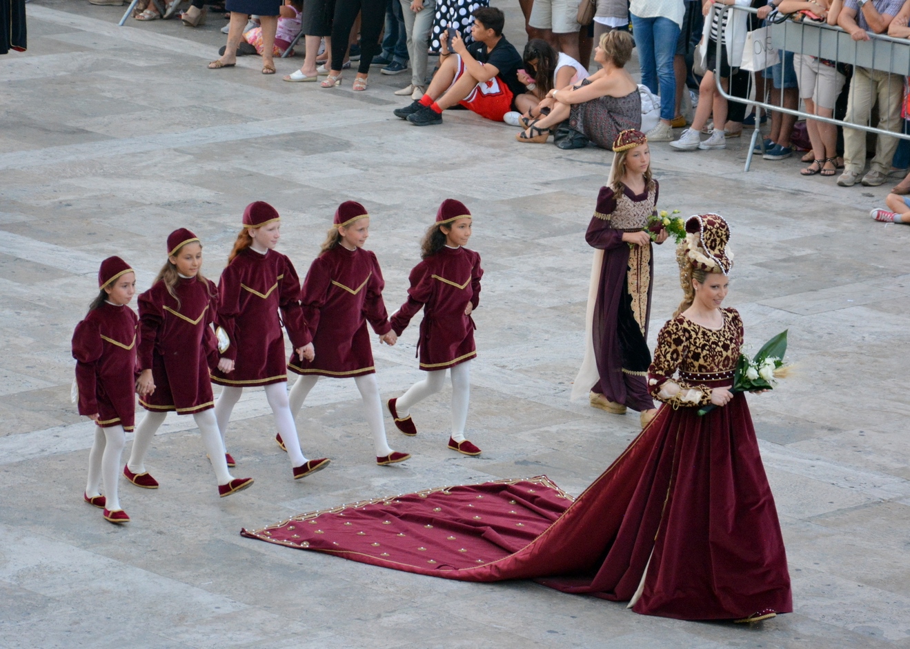 The advancement of the impressive parade is marked by the sound of drums and ancient trumpet. Inside it stand out the figures of the Magnifico Messere, but also those of consuls, captains, ladies, armies, archers, musicians and flagwaivers. The historical parade is opened by the municipal group, which is followed immediately by the vassal Castles of Ascoli Piceno and the six Sestieri of the Quintana. The order is according by the last ranking of the horse race. The mass of the figurines is planned in Piazza Ventidio Basso. From there the parade marchs along the characteristic streets of the historic center, passing through Piazza del Popolo, until reaching the ‘Squarcia’ Stadium. There, the six knights runs for the conquest of the Palio.