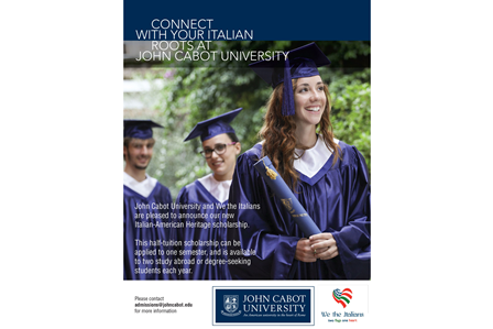 Today I'm very pleased to announce you the brand new John Cabot University and We The Italian's Italian-American Heritage Scholarship. In order to recognize this important tie between Italy and the U.S., as well as the legacy that Italian immigrants to the United States have contributed to both countries, John Cabot University and We The Italians are pleased to offer a half-tuition scholarships, to be applied to one semester, available to two study abroad or degree-seeking students each year.