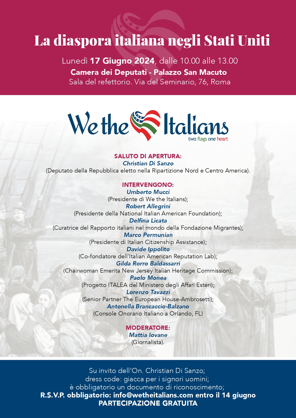 June 17 was another very tiring but also extremely interesting and positive day. It began at the Chamber of Deputies, where we brought the topic of the Italian diaspora in the United States into the Italian institutions, thanks to a large audience that came to listen to high quality national and international speakers called to debate this very important topic. Moderated by journalist Mattia Iovane (We the Italians Ambassador in Campania), after the opening remarks of the Honorable Christian Di Sanzo (Italian Member of Parliament elected in the North American constituency) I gave a brief welcome address. Then, the panel began. Robert Allegrini, President of the National Italian American Foundation spoke about “A community of 20 million Italians proud of Italy”; Delfina Licata, Curator of the Migrantes Foundation's Italians in the World Report and We the Italians Ambassador for Emigration, spoke about “The numbers and trends of the Italian diaspora in the United States”. Marco Permunian, President of Italian Citizenship Assistance, spoke about “Dual citizenship, the rediscovery of origins”. Davide Ippolito, Co-Founder with We the Italians of the Italian American Reputation Lab, gave a speech about “The Reputation of Italian Americans”, and Gilda Rorro Baldassarri, Chairwoman Emerita New Jersey Italian Heritage Commission, presented “The Universality of Italian Heritage Curriculum: Preserving the Italian Cultural Legacy”. Paolo Monea, ITALEA Project of the Ministry of Foreign Affairs, described “The Year of the Roots”, aka L’anno delle radici. Antonella Brancaccio-Balzano, Honorary Consul of Italy in Orlando and We the Italians Ambassador in Florida, spoke about “The Italian System between Consulates General and Honorary Consulates”. And finally yet importantly, Lorenzo Tavazzi, Senior Partner of The European House-Ambrosetti, presented their paper called “Enhancing the Power of the Global Italian Diaspora. Strategically managing an asset of value for the Italian system”.